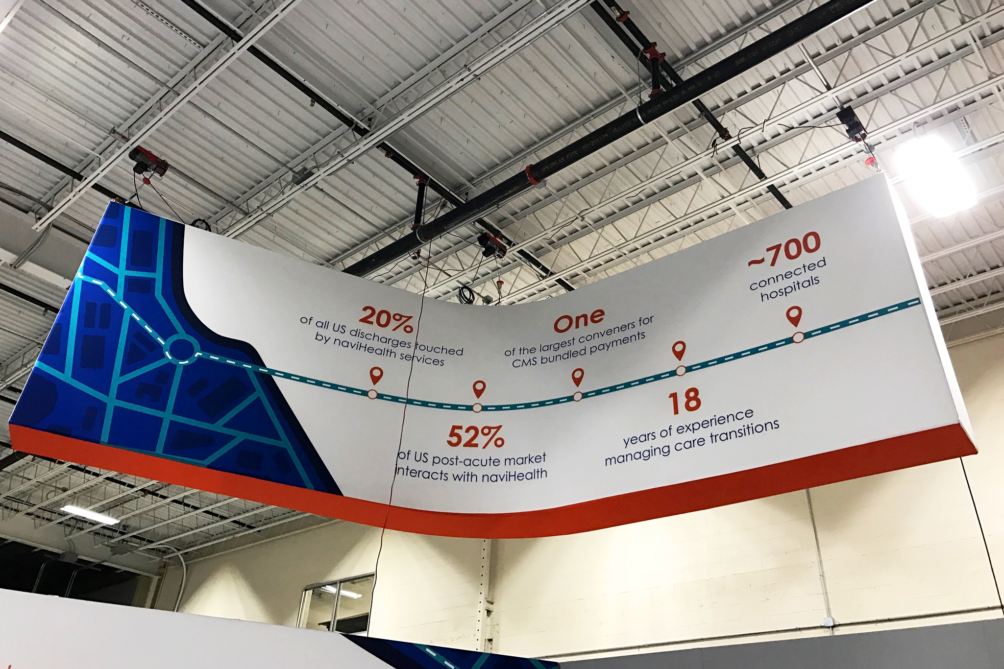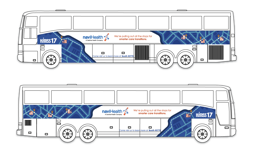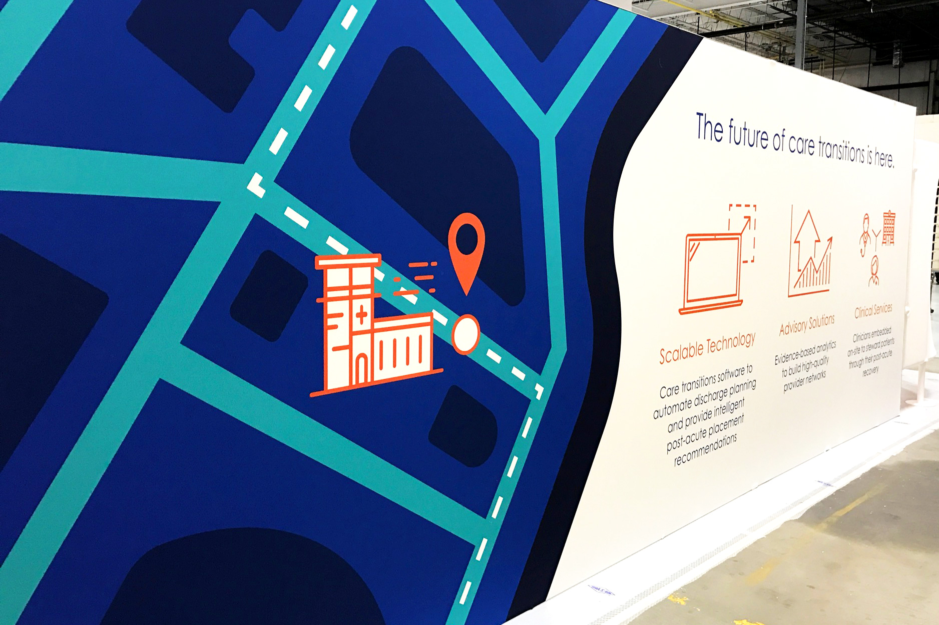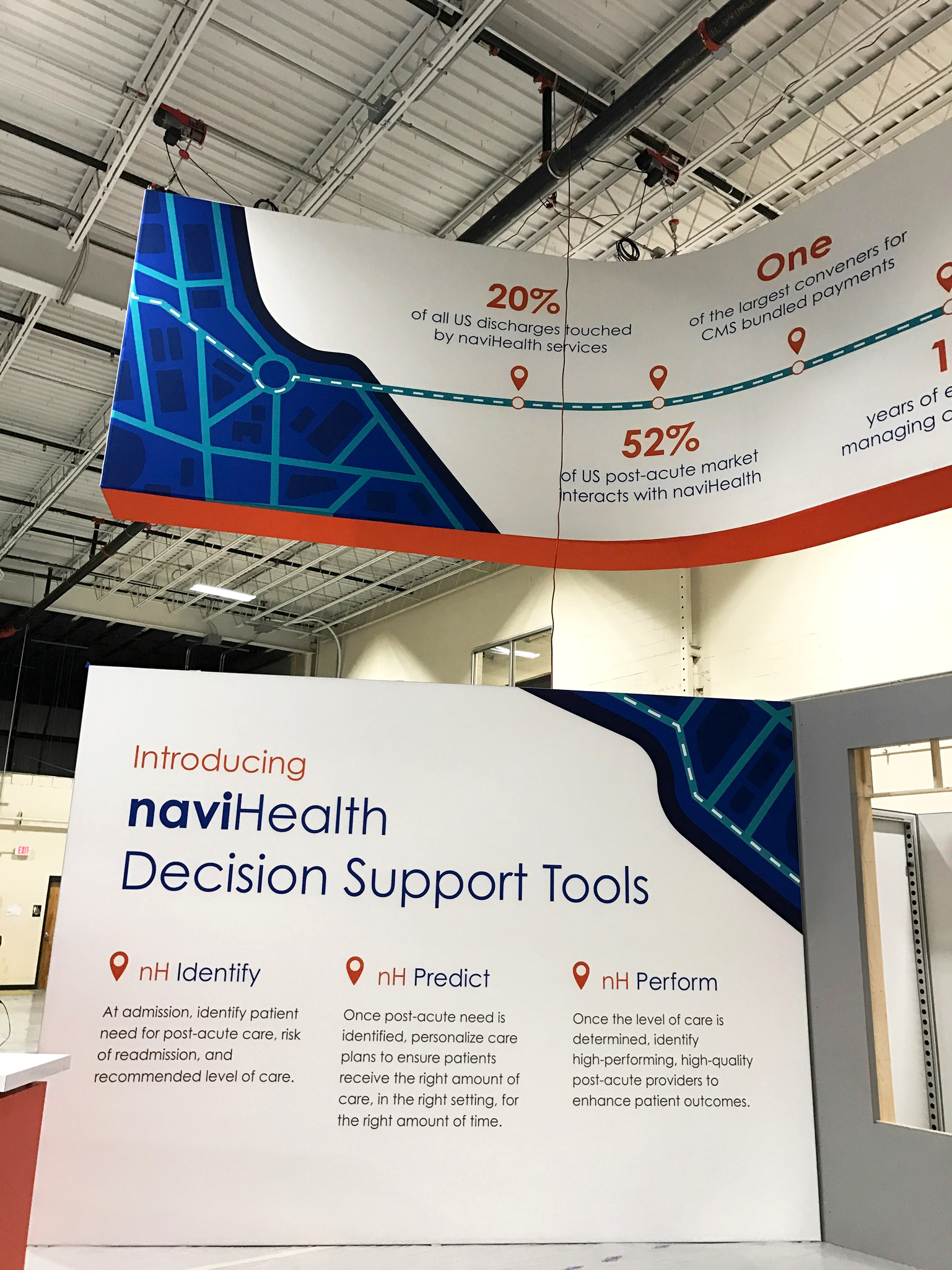 I was tasked with creating the theme and all marketing materials for naviHealth at HIMSS, medical technology conference. After acquiring Curaspan Health Group, naviHealth wanted a design that both represented the newly expanded company as well as the several new product offerings available after the aquisition, such as decision support tools. The GPS theme was developed to demonstrate naviHealth’s ubiquity, wealth of information and accuracy to support a patient throughout their journey between healthcare facilities.